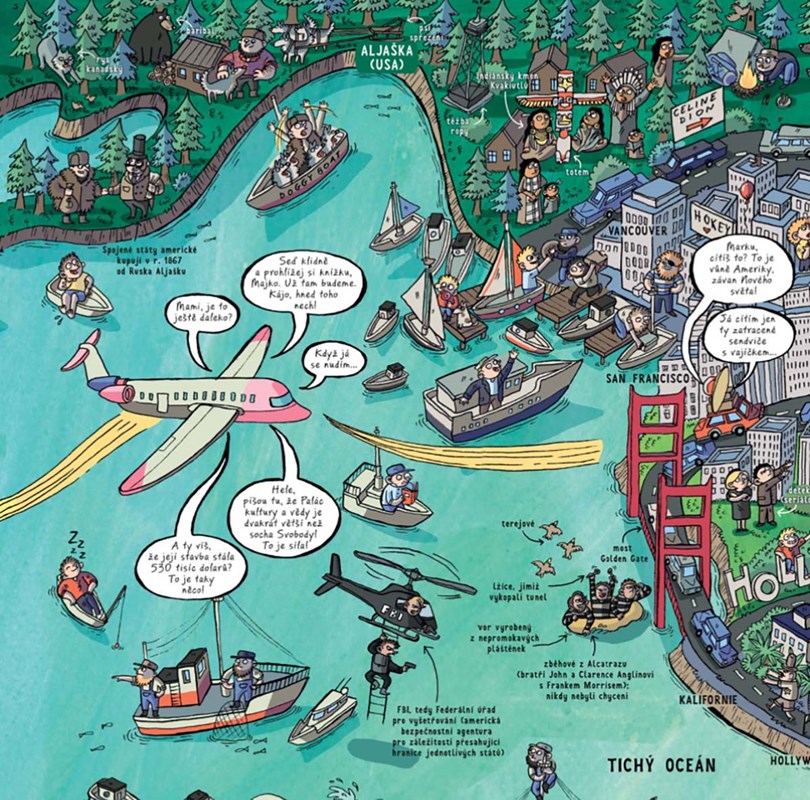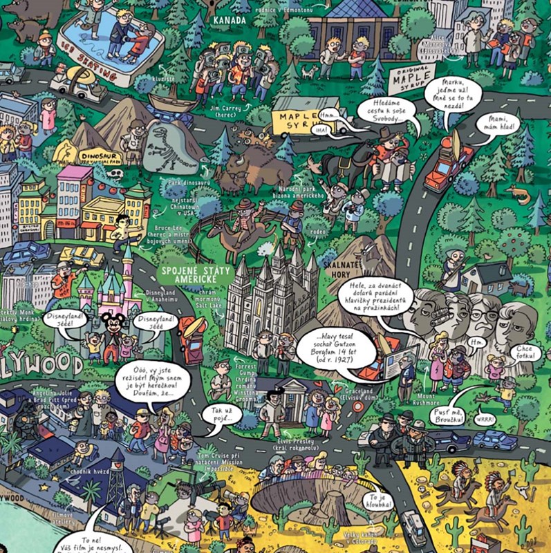 Knížka nabízí čtenářům dvě dobrodružné výpravy - ze severu na jih a z východu na západ. První trasou jde rodina opravdových cestovatelů, nebojí se ani nebezpečí, ani liduprázdných míst. Musí však spolupracovat, aby zdolala všechny nástrahy. Na druhou trasu se vydává sympatická rodinka, toužící navštívit nejproslulejší turistické atrakce. Sleduj dobrodružství hrdinů, lušti hádanky, řeš úkoly, ale hlavně poznávej svět. A to vše v poutavé komiksové podobě. Na obrázkové mapě najdeš kromě zeměpisných názvů i krátké popisy a zajímavosti u důležitých objektů. Knížku plnou zajímavostí můžeš prohlížet stránku za stránkou, jako obyčejnou knížku, nebo když ji rozložíš, měří harmonika víc než tři metry