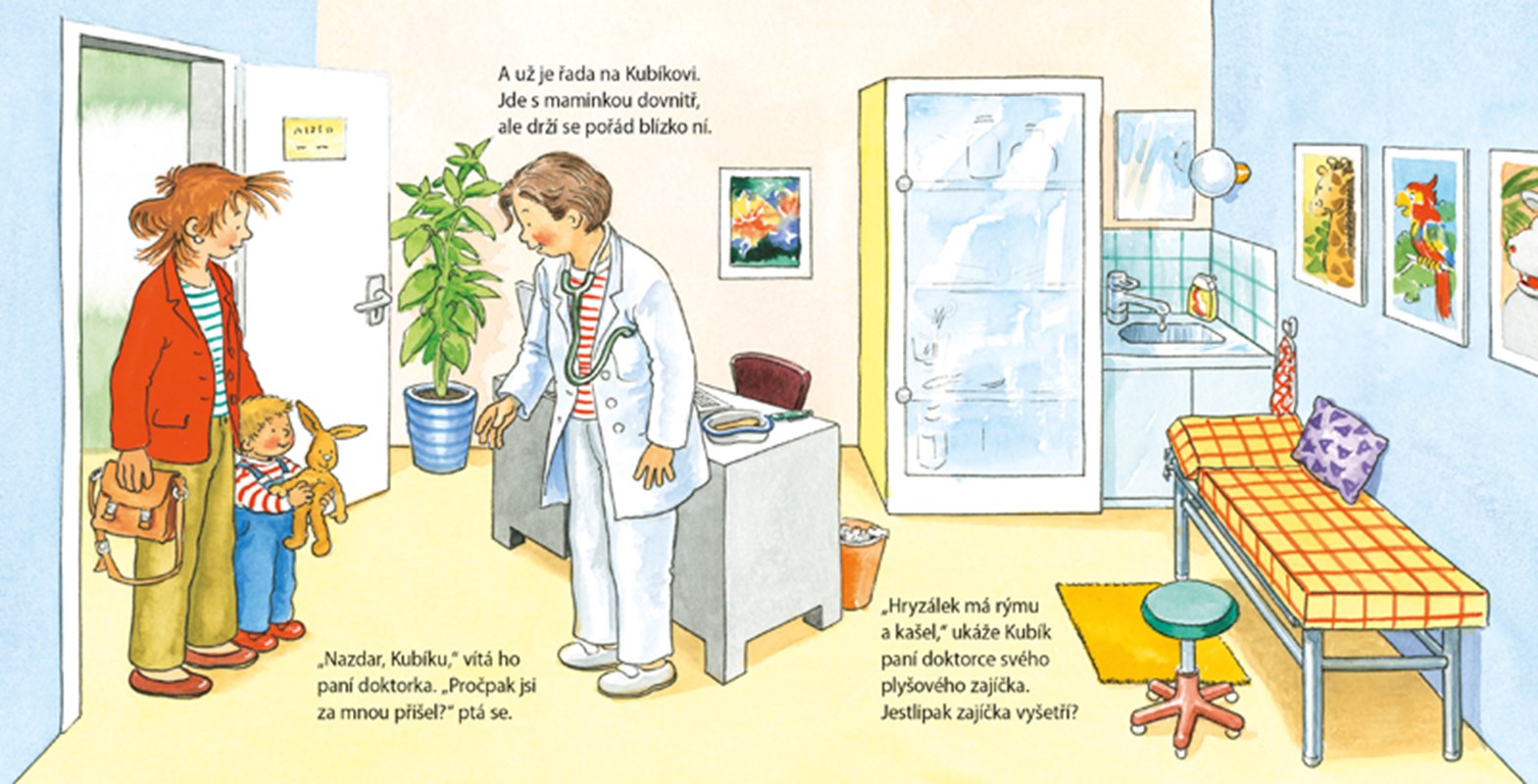 Kubík se nachladil, a tak s ním jde maminka k dětské lékařce. Nejdřív se Kubík maminky pevně drží, ale pak se nechá vyšetřit. Jak by ne, od takové hodné paní doktorky! Podívá se Kubíkovi do oušek a do pusy – a ani trošku to nebolí. Pak předepíše léky a ujistí kloučka, že bude brzy zase zdravý. Kubík má radost: návštěva u doktorky dopadla moc dobře. Pro děti od 18 měsíců.