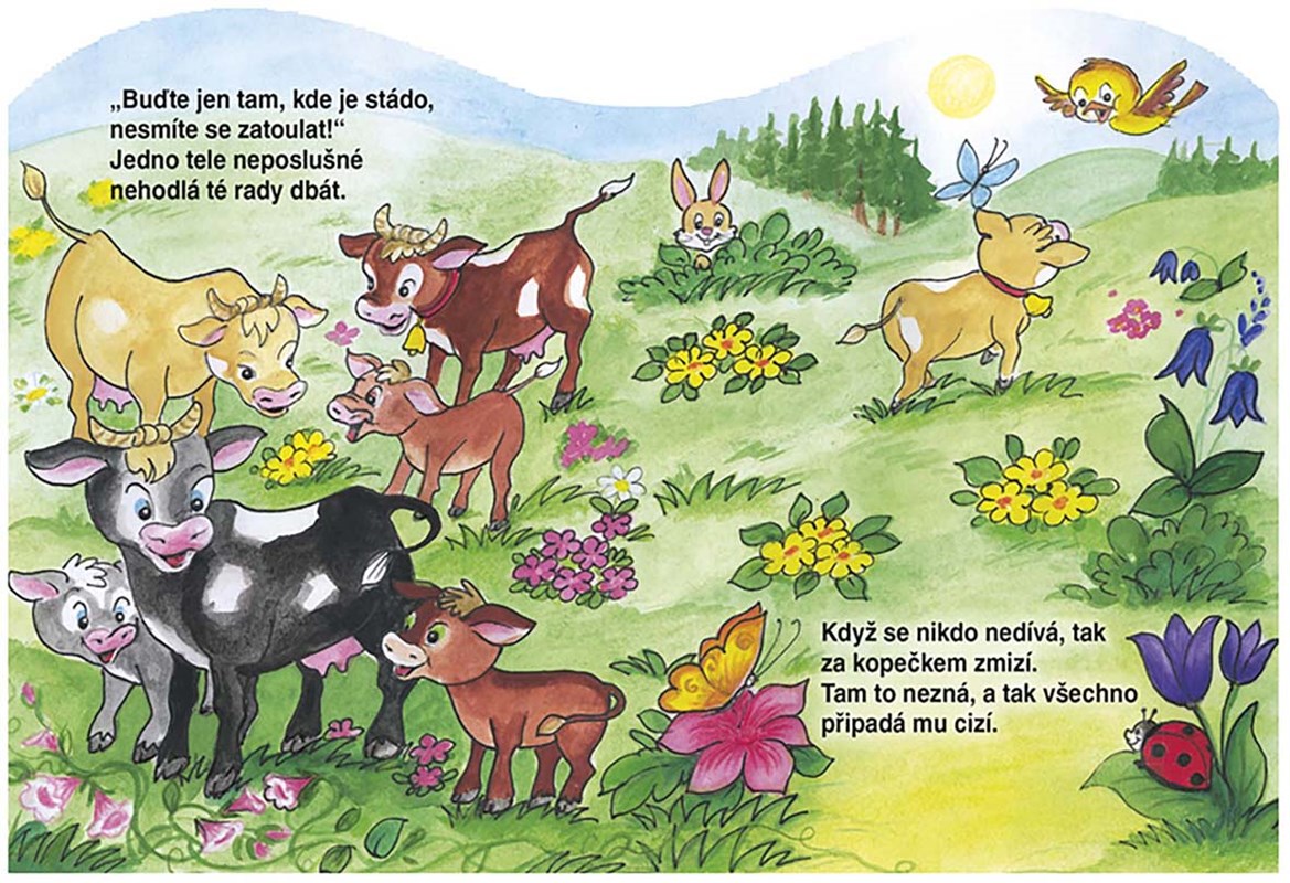 Příběh o telátku, které je zvědavé, co je za kopečkem a vzdálí se od svého stáda. Výsekové leporelo s veršovaným příběhem Zuzany Pospíšilové je určeno ke společnému čtení a objevování.
