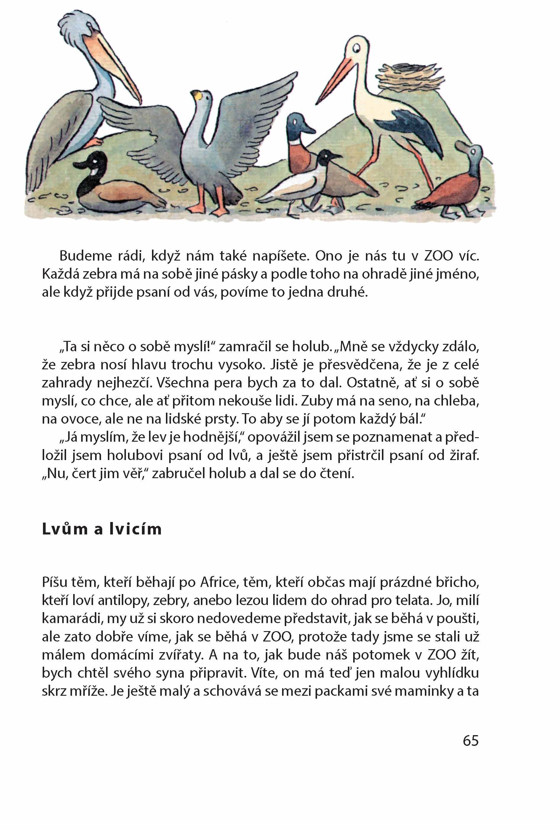 I když to zní podivně, i zvířata v zoologické zahradě mají svou vlastní poštu. A proč ne, také chtějí vědět, jak se daří jejich příbuzným v divočině. Hlavním listonošem je holub, který přináší psaní od tygrů z džungle, hrochů z močálu nebo od pštrosů, kteří báječně hrají fotbal. Ze zoo se vydává do Afriky za lvy, žirafami a zebrami, do daleké Austrálie nese dopisy klokanům a kaloňům nebo do Ameriky mravenečníkům a pumám.