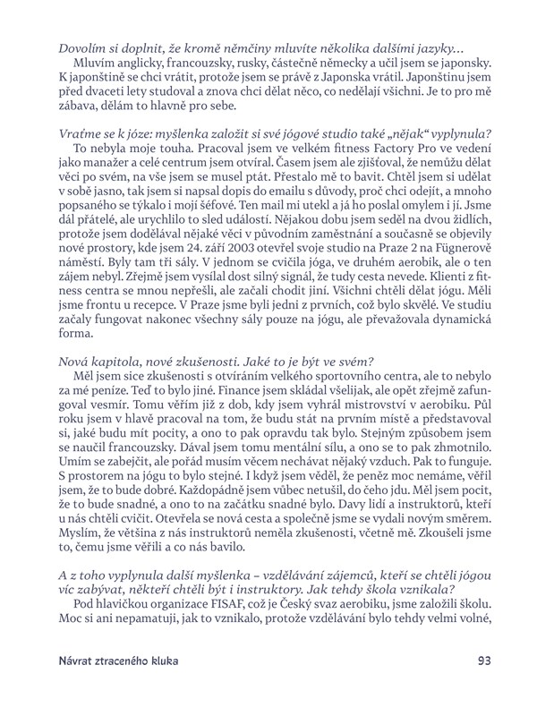 Soubor 24 rozhovorů s nejzajímavějšími osobnostmi, které se v ČR jógou zabývají, včetně starší generace, která u nás s jógou začínala už před revolucí. Jsou mezi nimi Václav Krejčík, Barbora Hu, Karel Nešpor, Lucie Königová, Dalibor Štědronský, ale také Daniela Fischerová, Eda Kriseová a další, kteří mluví o svých zkušenostech s jógou, o tom, čím je obohatila, ale také o různých úskalích, na která ve své praxi narážejí. Osobnosti jsou vybrány nejen napříč generacemi, ale také různými „školami“ a přístupy a výsledkem je tak skutečný průvodce po světě české jógy.