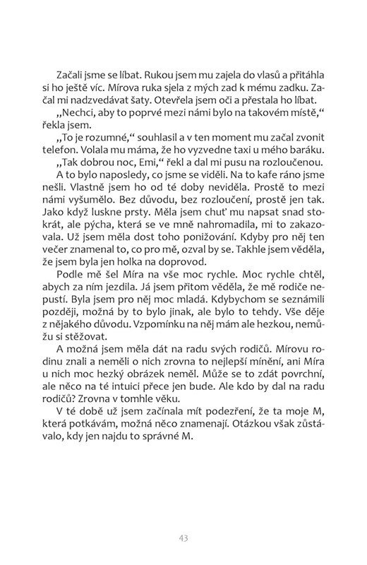 Věříte v magii jmen? Myslíte, že jména hrají v našich životech nějakou roli? Hrdinka knihy, dospívající Ema, za poslední dva roky nenarazila na žádného muže, který by měl jiné počáteční písmeno než M. Existuje pro ni nějaké správné M? Nebo je nakonec jediným emkem, které k životu potřebuje, jen ona sama? Román ve formě deníkových zápisků popisuje její emocionální pochody i události, které se jí přihodily, plné nečekaných souvislostí. Je všechno jenom náhoda, nebo mají hlubší smysl?