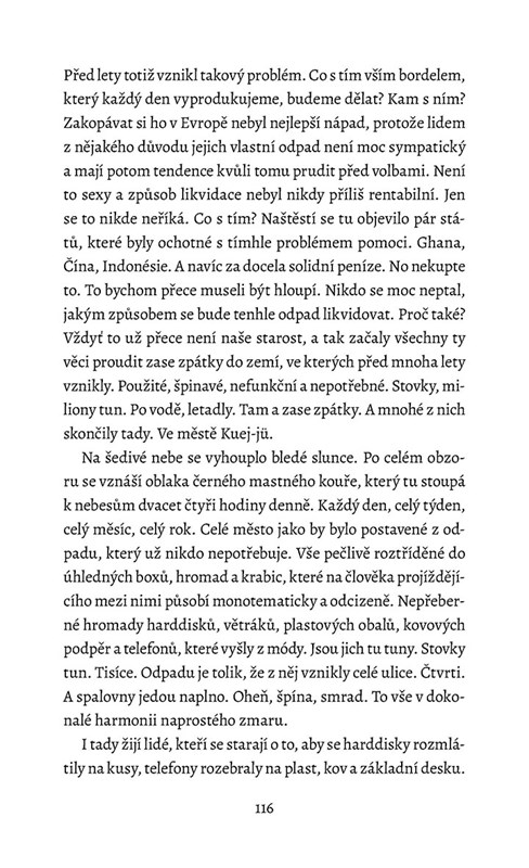 Dávám věci do pořádku. To je moje práce. Hasím průšvihy pro textilní korporace na druhé straně světa. V Indii, Číně, Indonésii nebo Pákistánu. Viděl jsem bouřky nad Himálajem a svítání na ostrově, co není na mapě. Cítil jsem déšť uprostřed džungle v Malajsii a spalující horko na indických pláních. Slyšel jsem burácení vodopádů v Bangladéši a praskání ledovců v Arktidě. Potkávám lidi, které nikdo nezná, a vídám věci, které bychom měli znát, ale nechceme. Někdy mi jde o krk a jindy mi do klína spadnou všechny krásy světa. Řekl bych vám, abyste se připoutali, ale tahle jízda je bez pásů. Tak se mě držte.