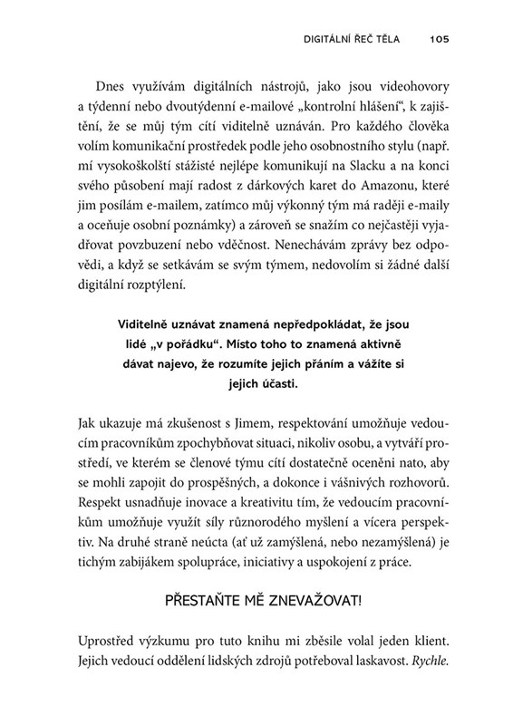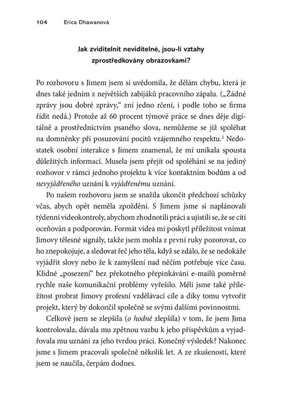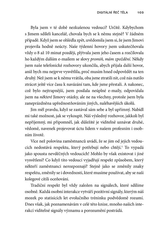 Lidé odnepaměti spoléhají na řeč těla jako na nedílnou a velmi důležitou součást mezilidské komunikace. V dnešní době však většina komunikace probíhá zpoza obrazovky počítače či displeje mobilního telefonu a tradiční signály řeči těla již nejsou viditelné. Následky jsou zřejmé – nejednoznačné zprávy, nepochopení či dokonce ztráta důvěry. Jak si tedy lépe porozumět, jak se vyhnout infomačním šumům? Renomovaná autorka Erica Dhawan vás názorně a srozumitelně provede všemi úskalími elektronické komunikace. Dozvíte se, jak dekódovat nové signály a podněty, které nahradily tradiční „body language“. Naučíte se, jak vést videokonference, psát e-maily a porozumíte skrytým zákonitostem veškeré možné komunikace bez ohledu na vzdálenost.