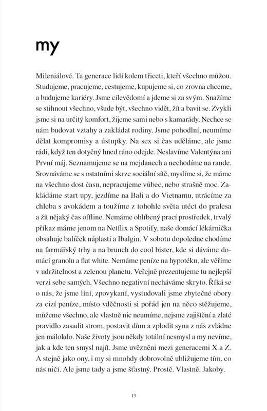 M hledá smysl života, R začíná znovu, A žije ve vztahu plném lží a K stále utíká sama před sebou. V životě těchhle čtyř mileniálek zdaleka nejde jen o avokádové tousty. Čeká vás příběh plný přátelství a lásky, ale i závislosti, deprese, lži a smutku. Najdou se v něm všichni, kteří mají někdy pocit, že je jejich život absolutní nesmysl, nevědí, kde a jak ten smysl najít, a zjišťují, že na dně filtrované kávy to asi nebude. Dobrovolně si ubližují tím, co je ničí. Ale naštěstí přijdou na to, že za každým mrakem je schované slunce. Tuhle knihu možná přečtete za chvíli, ale zůstane ve vás ještě dlouho potom.