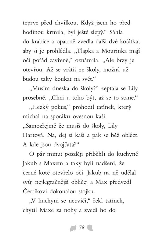 Maminka malé Lily přinese domů tři slabá koťátka, která se našla opuštěná venku pod keřem. Kočičí miminka potřebují hlídat a pravidelně krmit. Celá rodina, včetně fenky Meg, si malé chlupáče ihned zamiluje. Lily se snaží co nejvíce pomáhat a o mláďátka pečovat. Podaří se koťátka zachránit, nahradit jim maminku a najít nový domov? Krásný příběh o lidech s dobrým srdcem, kteří pomáhají zachraňovat zvířátka.