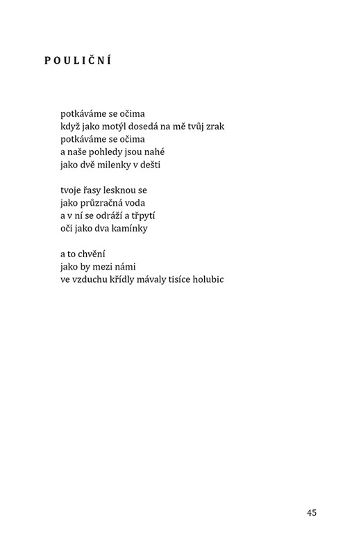 Poezie krás i každodenních všedností. Radostí, co si nosíme po kapsách a co nás hřejí tam někde na hrudi. Je to jako ležet uprostřed rozkvetlé louky. Ležet naznak a bát se padání.