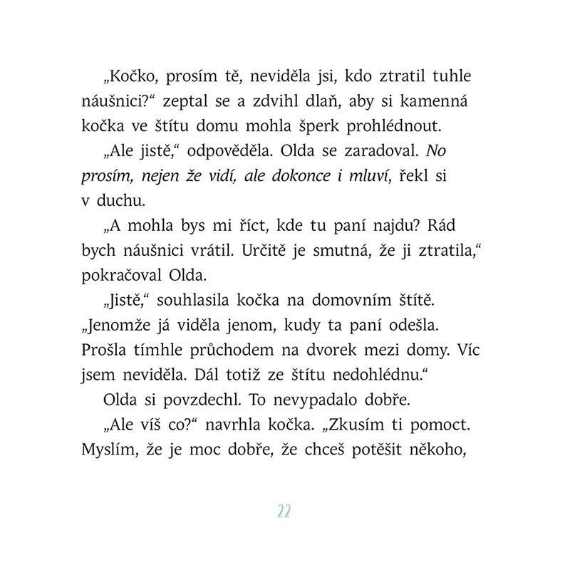 Hustá sněhová pokrývka, usmívající se lidé a vůně pečených kaštanů… malý Olda miluje vánoční trhy, po kterých už brzy přijde Ježíšek. Letošní advent mu ale přichystá jedno velké překvapení. Když se chlapec s maminkou vydá na procházku po Královnině ostrově, objeví mezi dlažebními kostkami zlatou náušnici s velkým červeným drahokamem. Olda se ji rozhodne vrátit, jenže jak její majitelku v rušných uličkách najít? Stačí špetka vánočního kouzla a samotné město ožije, aby mu pomohlo.