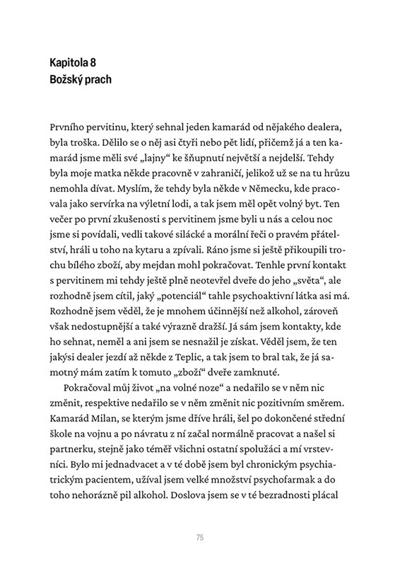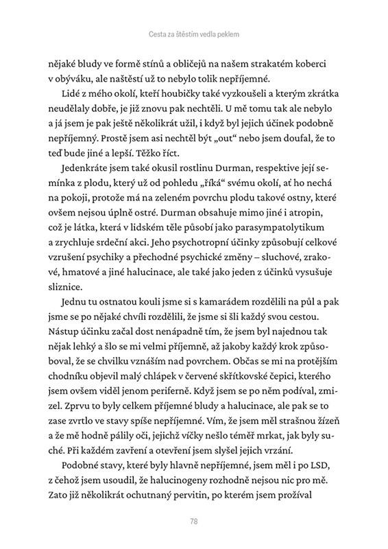 Kniha přináší zpověď člověka, který se již v dětském věku setkal s návykovými látkami. Jeho rané euforické zkušenosti jej dovedly až k silné drogové závislosti a zásadně ovlivnily jeho další osudy. Autor upřímným způsobem popisuje vývoj a proměny závislosti, a to včetně snahy s návykovými látkami jednou provždy skončit. V tomto případě vše naštěstí nekončí osobní katastrofou, i když k ní scházel jen krůček. Možná právě autorův pád téměř na dno přispěl k tomu, že se dokázal odrazit zpět.
