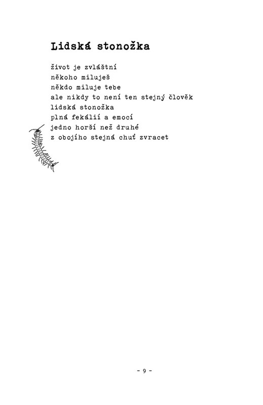 Sbírka volných veršů, kterou autorka napsala v době, kdy se u ní poprvé začaly projevovat známky poruchy osobnosti, ale stále byla příliš mladá, aby dostala diagnózu. Psaní jí alespoň na chvilku pomáhalo přestat cítit tolik emocí najednou nebo naopak pomáhalo s nesnesitelným prázdnem, které výboje emocí střídalo. Má okolo sebe spoustu známých se stejnou diagnózou a těm její texty pomáhají vědět, že na to nejsou sami. Proto věří, že kniha může pomoci i spoustě z vás.