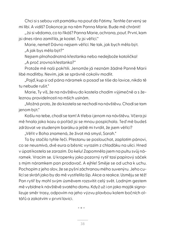 Prostý turistický výšlap se během dní přetavil v duchovní cestu, během které rozmlouvá se svým vnitřním já, s fiktivní Marií. Cesta do Fátimy je tak pro ni zároveň cestou do vlastního nitra, kde se Sarah setkává s kýmsi nečekaným: se sebou sama.