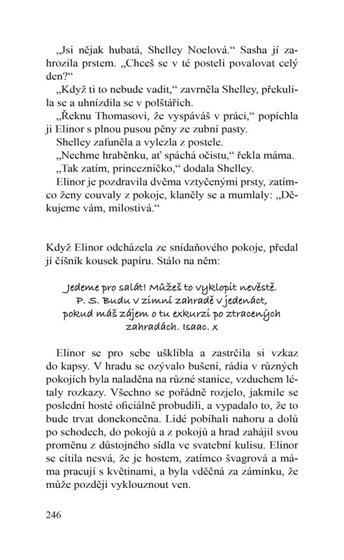 Elinor Noelová, zvaná Nory, vede v Londýně malý antikvariát a je se svou nenáročnou existencí spokojena. Nikdy ji neokouzlil extravagantní životní styl jejích spolužáků z privilegované soukromé školy Braddon-Hartmead, kterou navštěvovala jako stipendistka. Přes všechny rozdíly si s nimi však vybudovala pevné pouto, přetrvávající i po letech. Dva spolužáci, kteří se chystají vzít, nyní dokonce pozvali celou partu na týdenní oslavu před svatbou na hradě nedaleko bývalé školy. Nory ale netuší, že se na anglickém venkově kromě přátel setká i s dalším starým známým, nyní hlavním hradním zahradníkem. Zatímco s ním během předsvatebních dní tráví víc a víc času, zjišťuje, že se do svého dětského „úhlavního nepřítele“ po uši zamilovala.