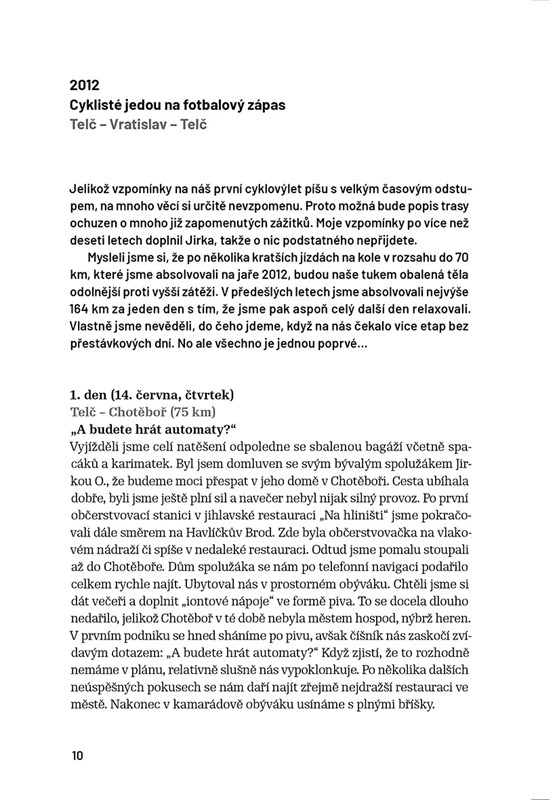Po jednom z mnoha heců v hospůdce vznikla mezi kamarády s ne úplně sportovními těly nepsaná tradice – jednou za rok se vydat na delší cestu na obyčejných kolech bez jakékoliv dopomoci motorků či podpůrného týmu. Jejich motorem byla touha poznávat nové lidi, kulturu a hlavně zažít mnoho nových dobrodružství. Následujících 11 let vyjížděli na kolech do různých destinací Evropy. Na mnoha místech poznali obyčejné i neobyčejné lidi a zažili spoustu humorných historek. Nejen o ně se chce autor nyní podělit se čtenáři.