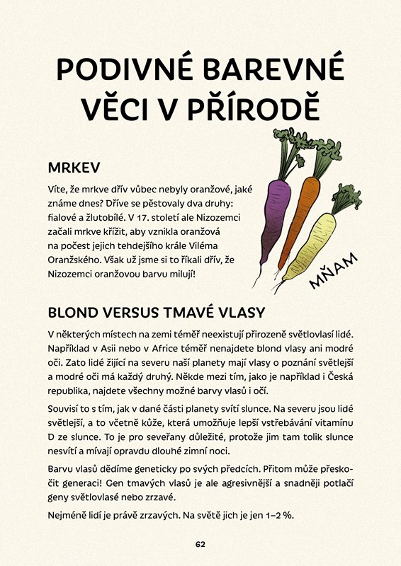 Co vás napadne, když se řekne BARVY? Tempery, vodovky, možná pastelky... prostě výtvarná výchova? Milá průvodkyně této knihy, Bětka Všudybýlková, vám ukáže, že svět barev je daleko pestřejší a nejde v něm jen o malování! Jak s barvami souvisí černobílý film, indický festival nebo třeba mumie? Jak to, že vidíme barvy, která města světa jsou nejbarevnější, a jak vlastně funguje barevný film? Na tyhle a další otázky vám Bětka odpoví v kapitolách této knihy plné interaktivní zábavy, navíc doplněné pracovními listy, které se dají využít jak při čtení doma, tak i ve škole. Pracovní listy můžete stáhnout na www. albatrosmedia.cz v detailu knihy – záložka Ke stažení. Jistě vás potěší také plakáty a omalovánky připravené k vytištění.