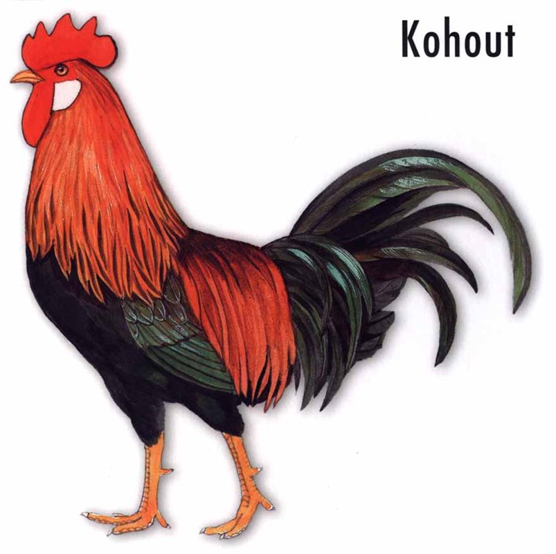 Základní domácí zvířata v realistické výrazné kresbě (pes, kočka, koza, kráva, ovce, králík, slepice…).